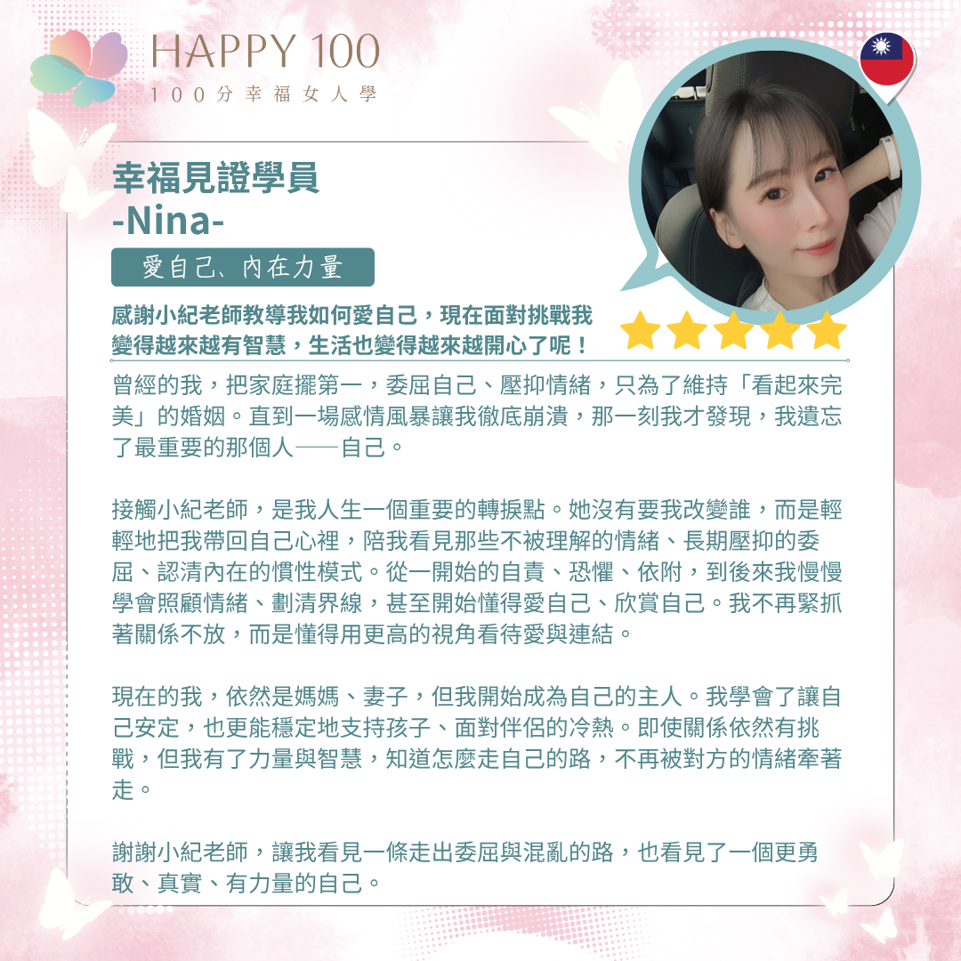 現在的 Nina,依然是媽媽、妻子,但她成為了 自己人生的主人